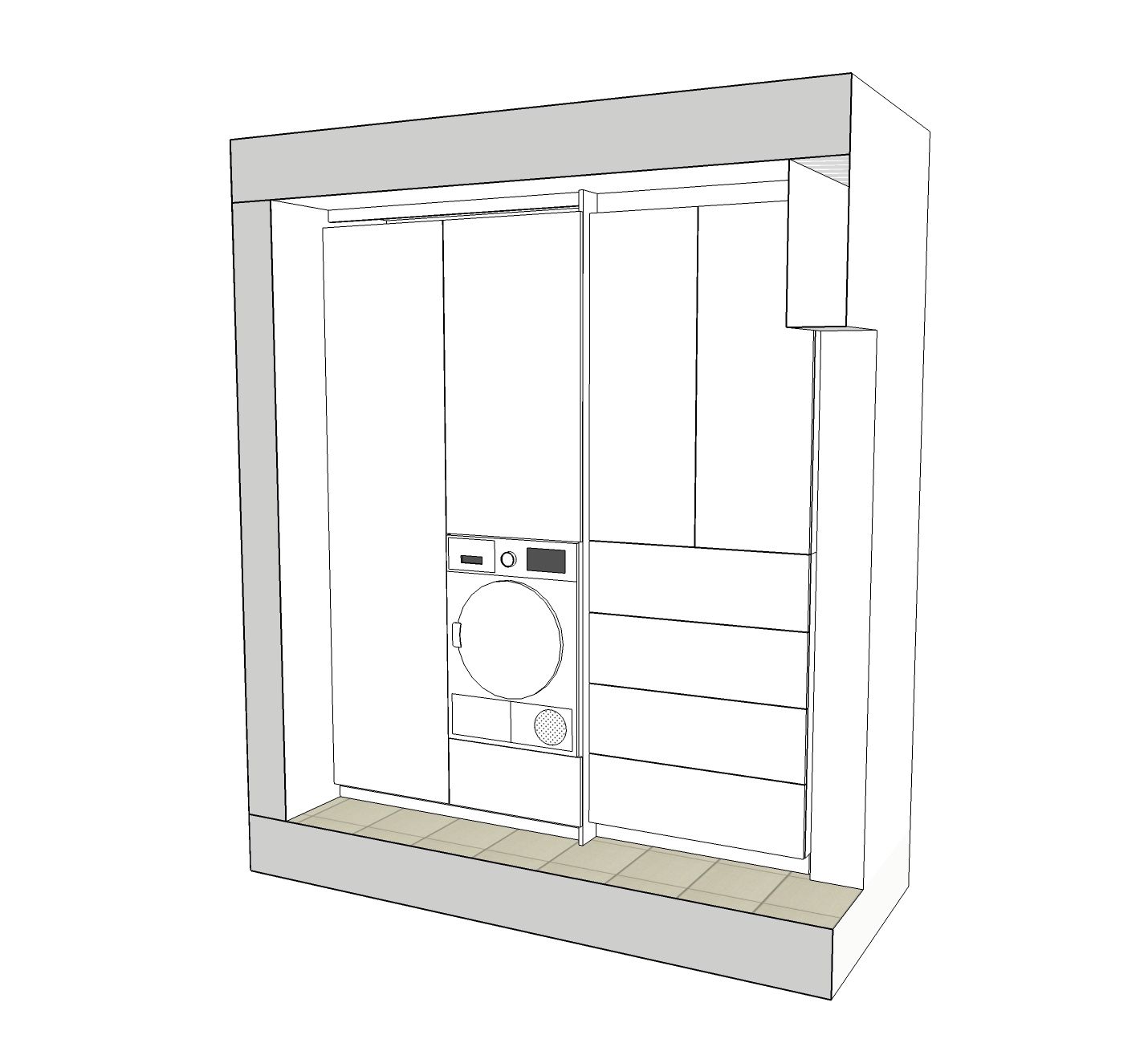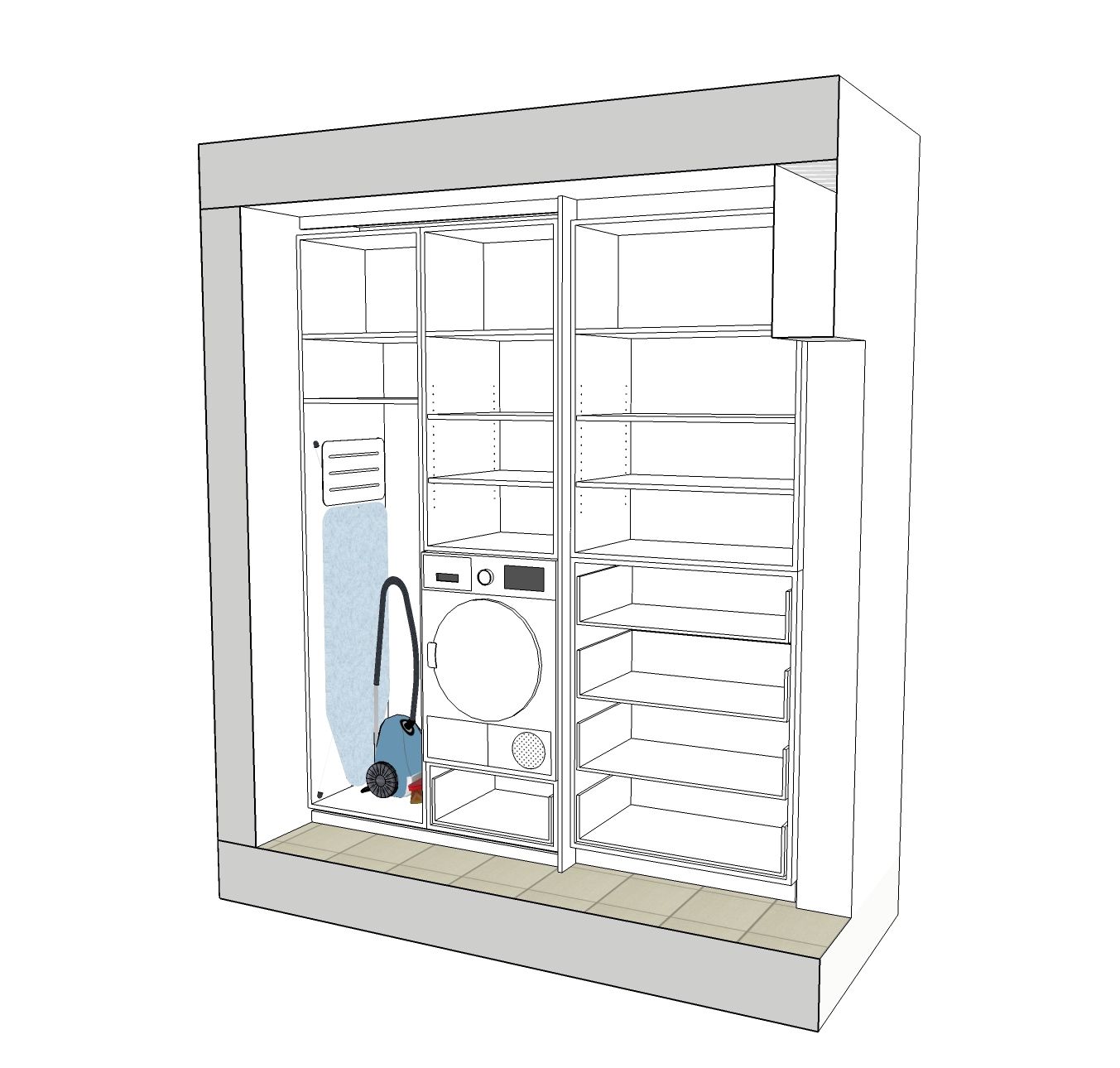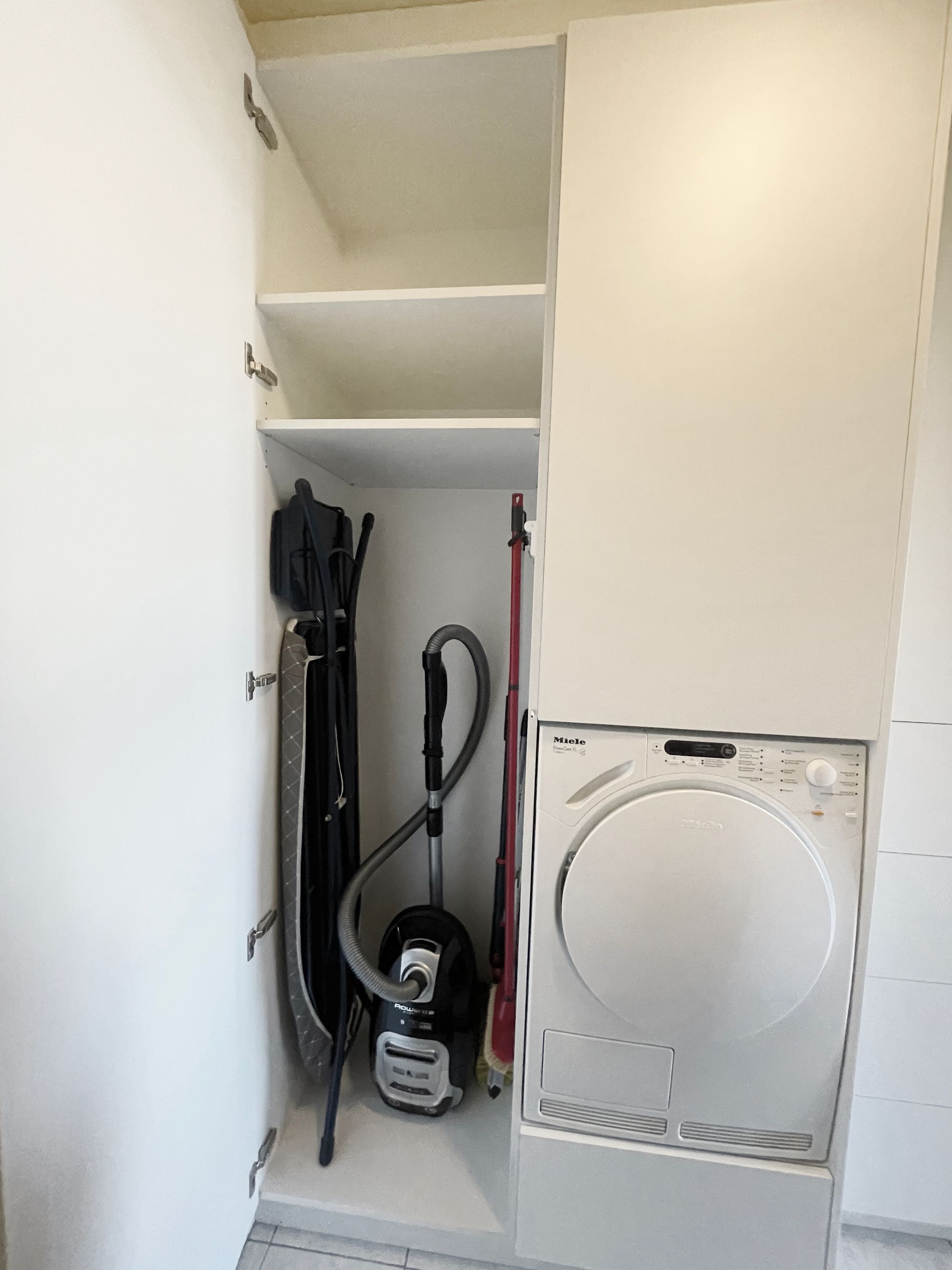 Bij deze berging lag de nadruk op alles zoveel mogelijk te integreren en ergonomischer te maken. Zo werden de vaatwasser, wasmachine en droogkast hoger geplaatst en geïntegreerd in het maatwerk. Er werd ruimte voorzien om op een handige, toegankelijke manier de strijkplank, stofzuiger en borstels proper op te bergen.