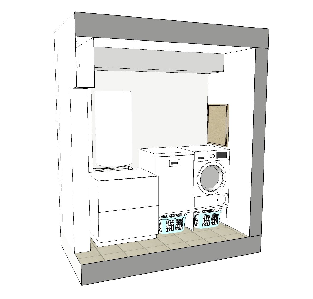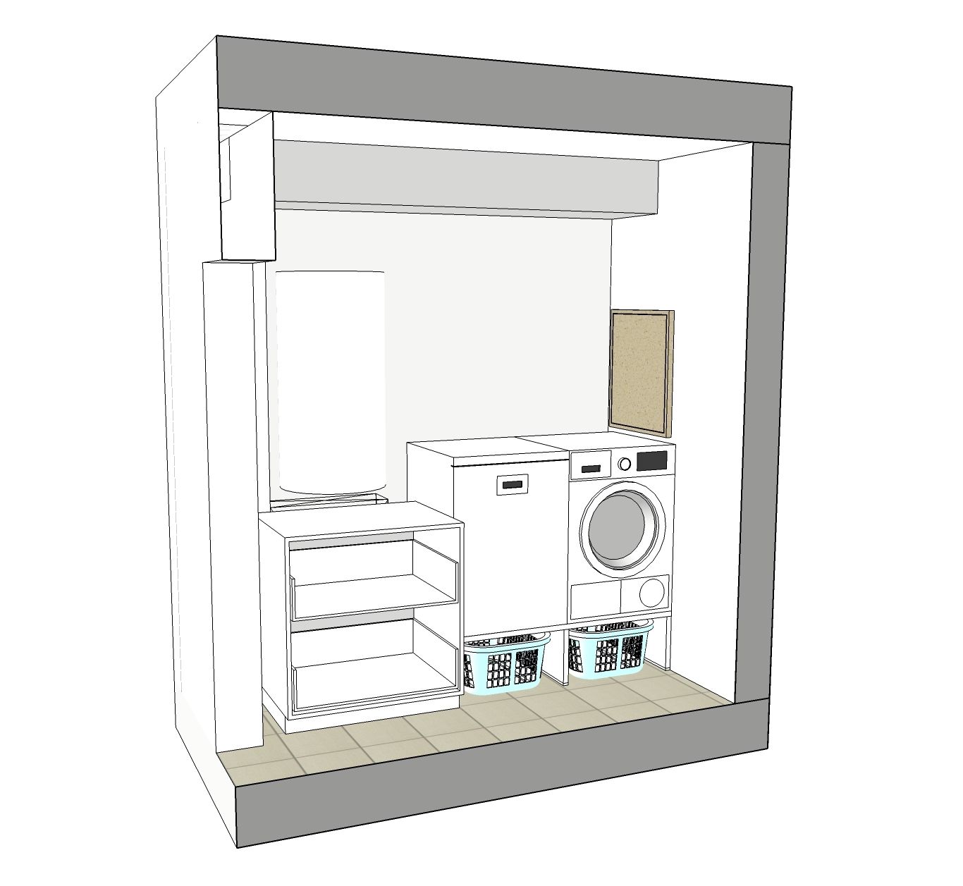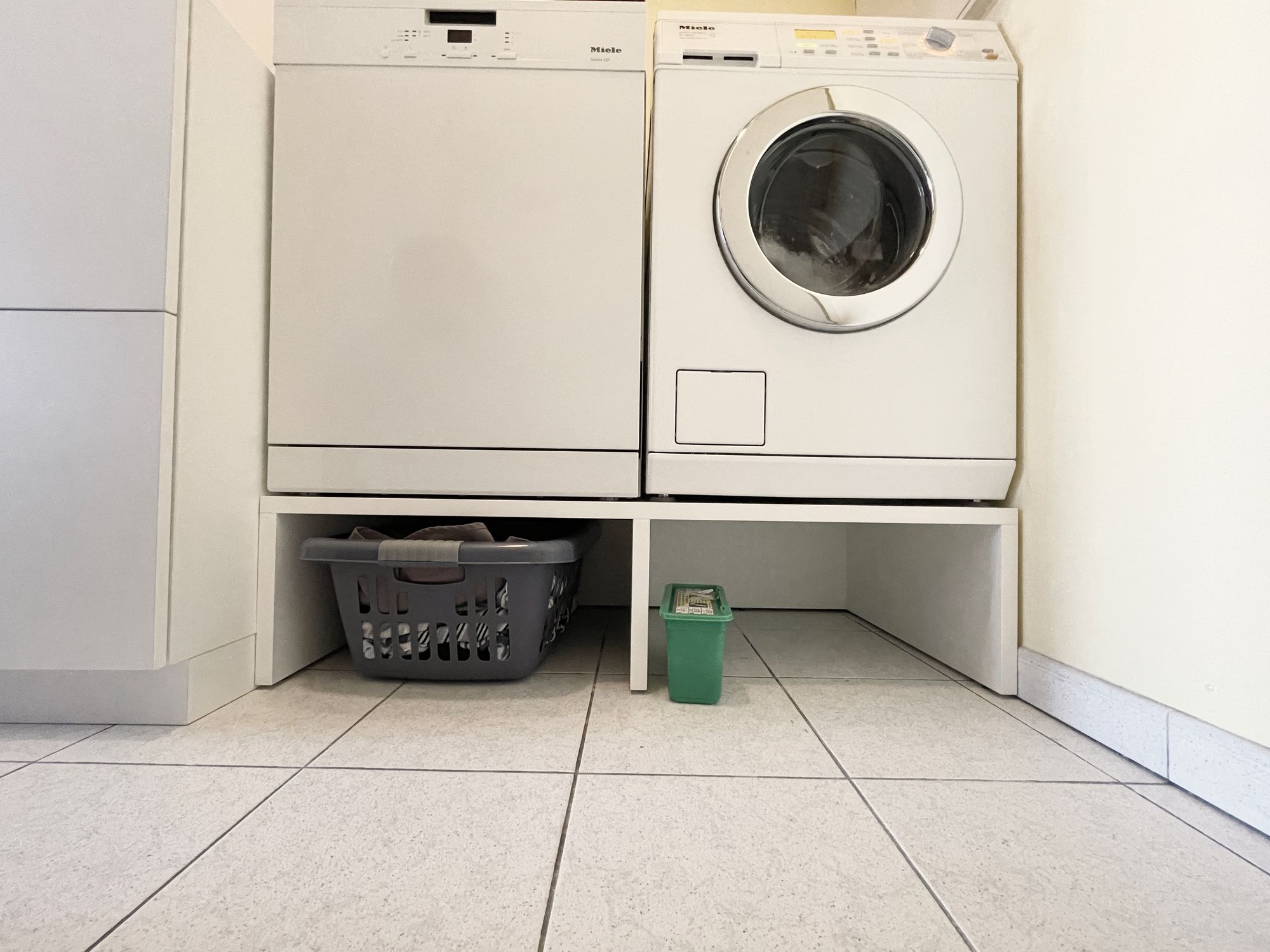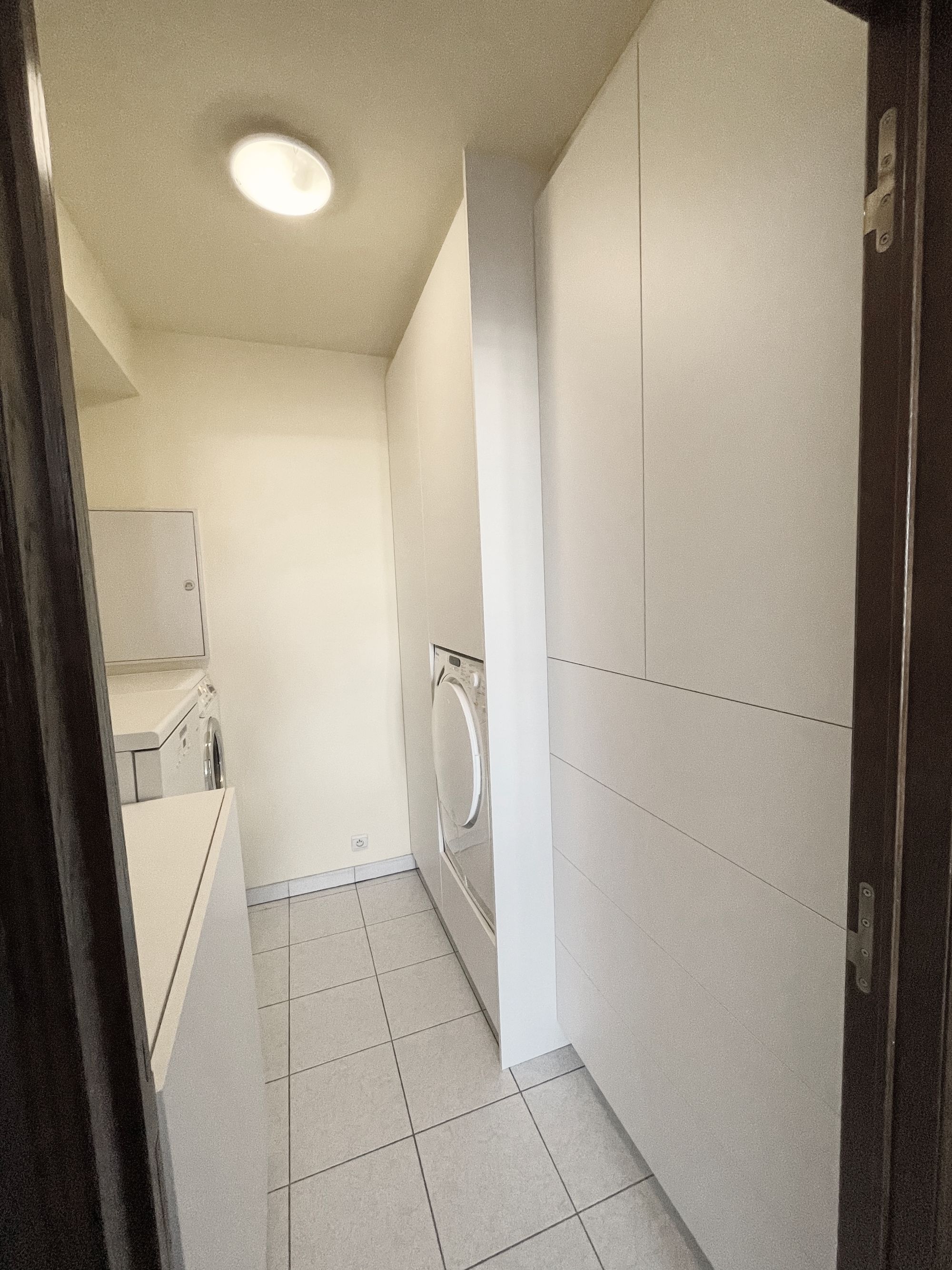 Bij deze berging lag de nadruk op alles zoveel mogelijk te integreren en ergonomischer te maken. Zo werden de vaatwasser, wasmachine en droogkast hoger geplaatst en geïntegreerd in het maatwerk. Er werd ruimte voorzien om op een handige, toegankelijke manier de strijkplank, stofzuiger en borstels proper op te bergen.