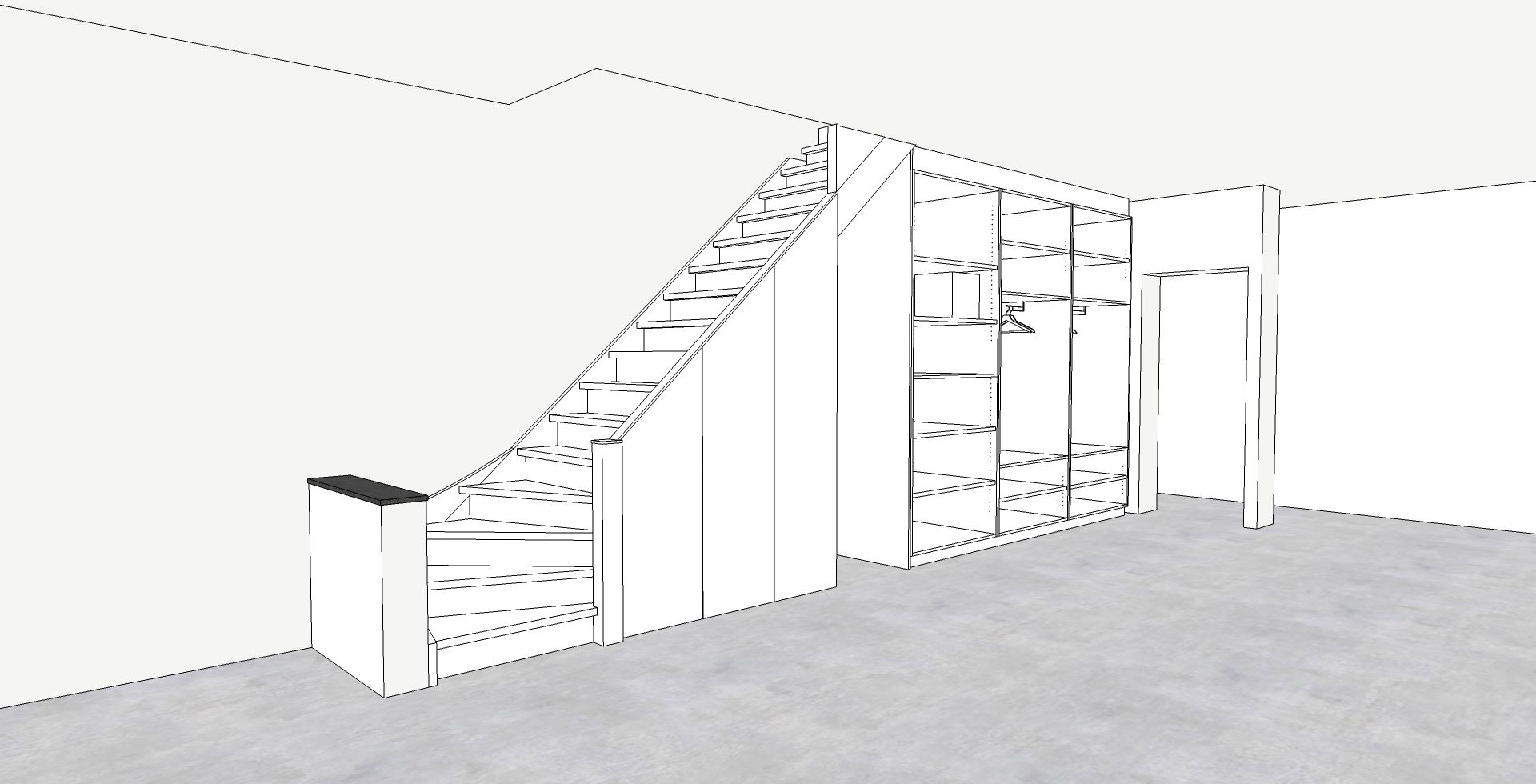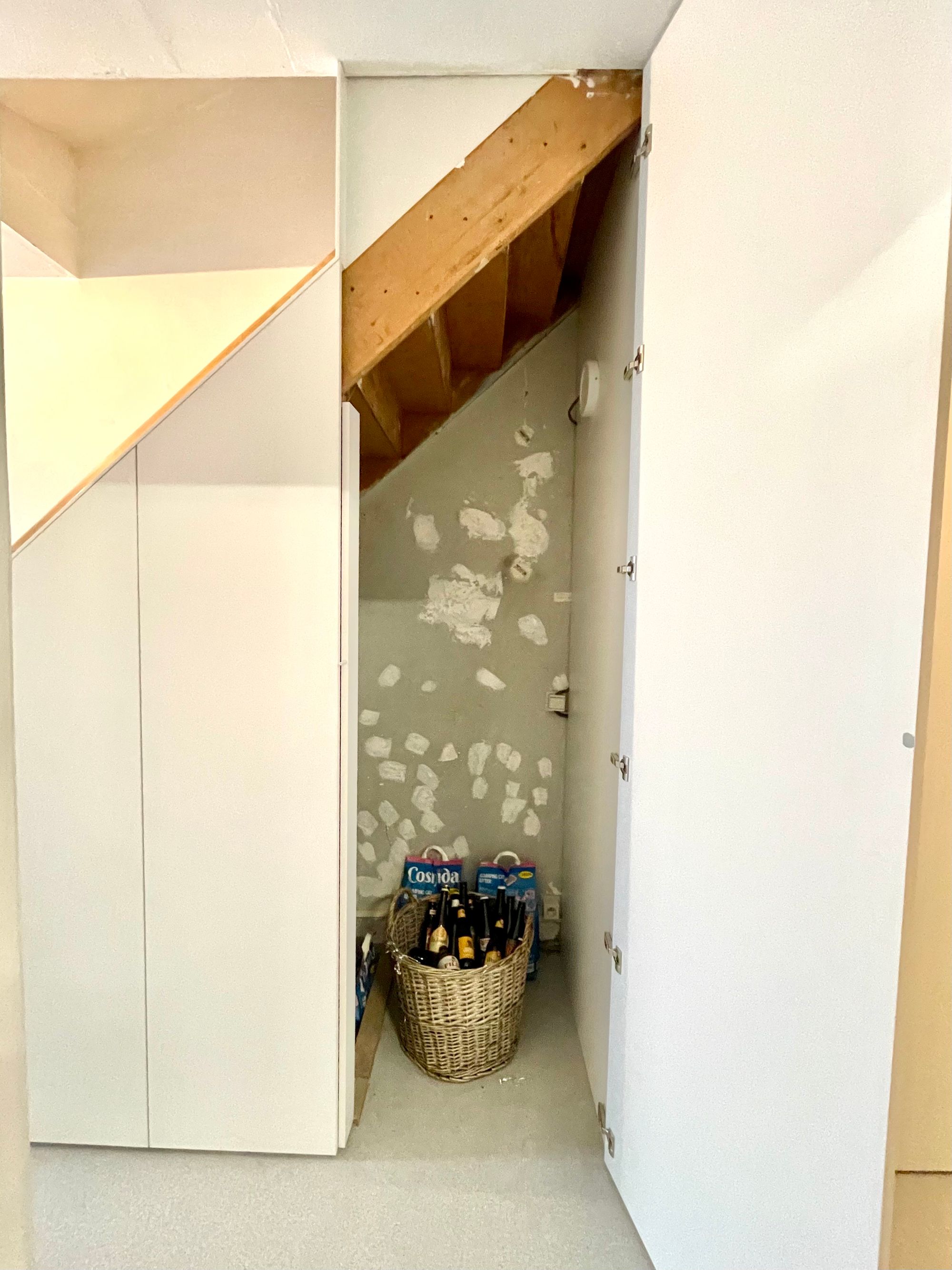 Bij dit project in Zwijnaarde wou de klant de ruimte onder trap en de zijkant van de trap samen integreren tot 1 strak geheel. Bij een keten die zogezegd “kasten op maat” maakt, bleek dit echter niet mogelijk: te complex en bijgevolg buitensporig duur. Gelukkig kwam men via reeds tevreden klanten bij ons terecht.