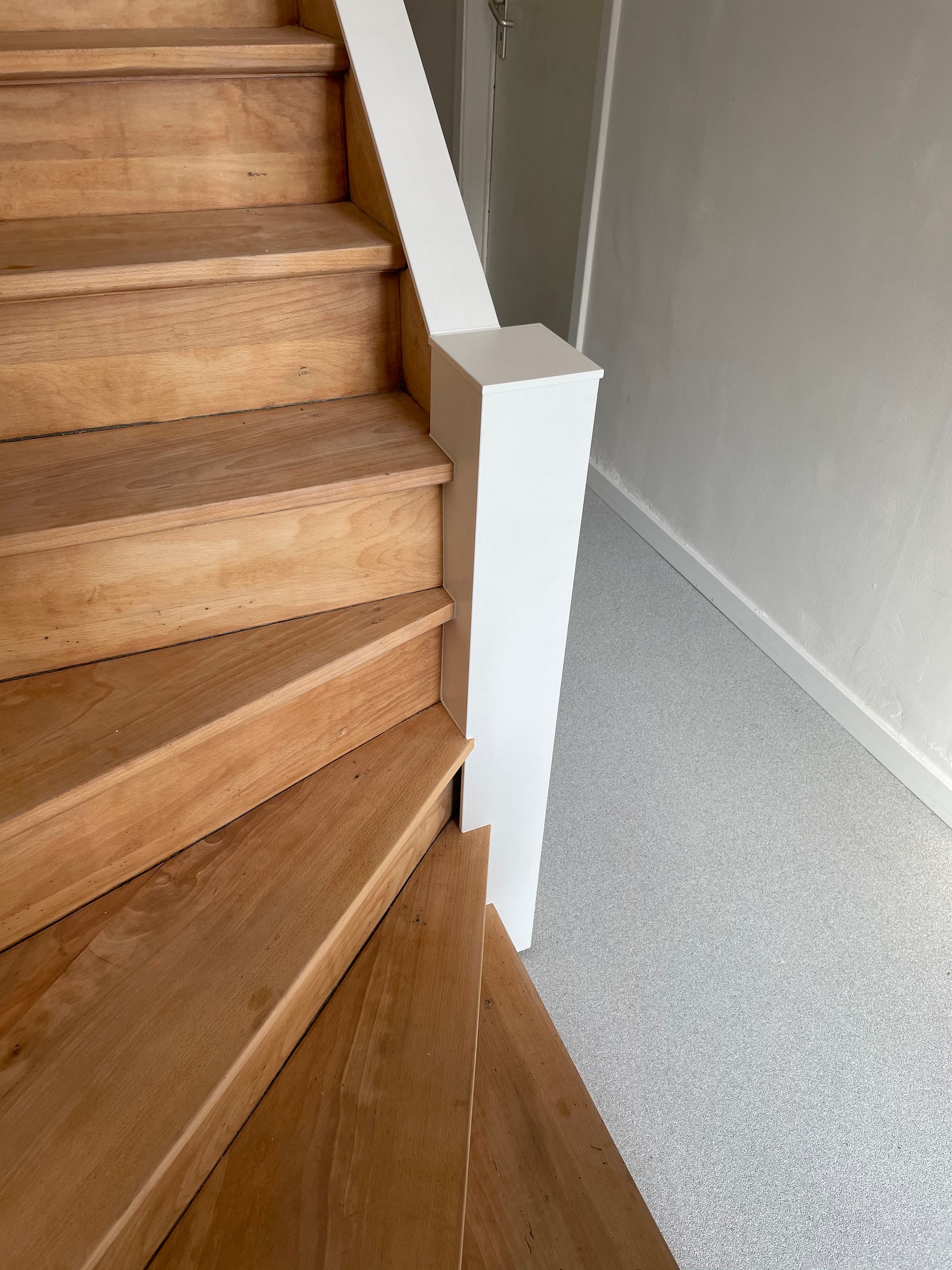 Een trapafsluiting maken die past bij de bestaande trap, dat was de opdracht bij dit project. Door hetzelfde materiaal te nemen, konden we ervoor zorgen dat het lijkt alsof beide samen geplaatst geweest waren.