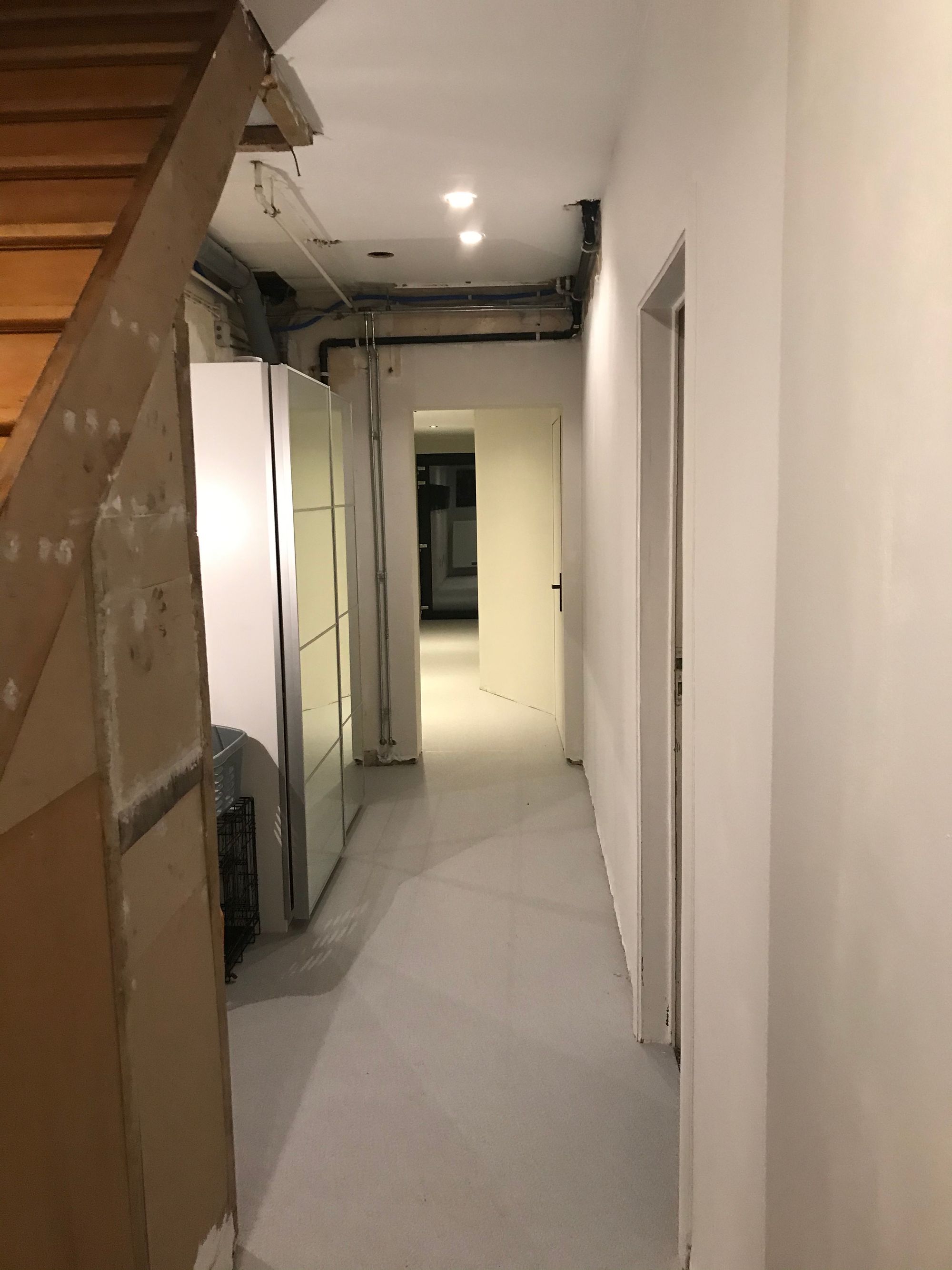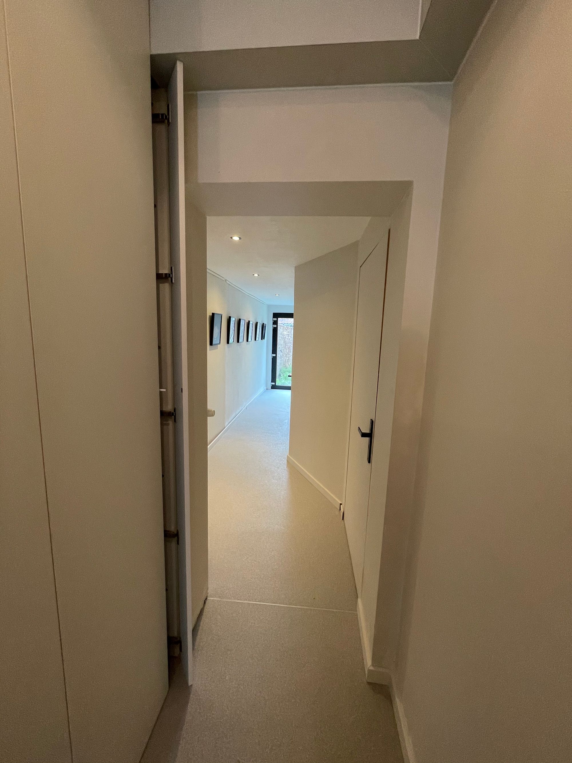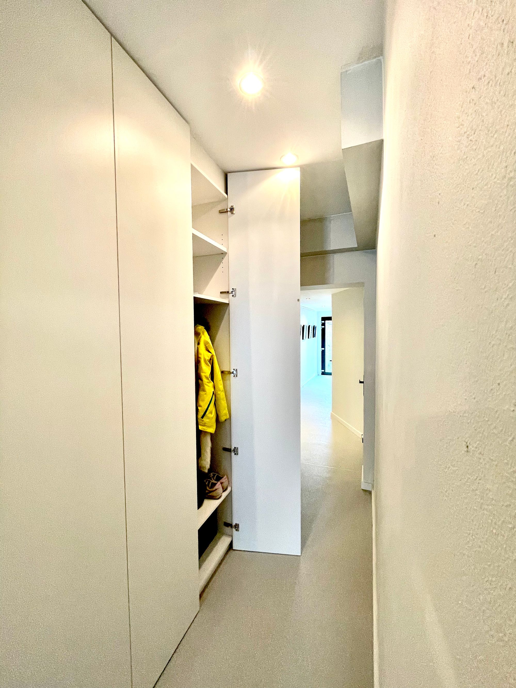 Doordat de fronten tot op 10mm van plafond en vloer komen en in 1 stuk doorlopen van rond de trapkolom tot helemaal achterin de gang wordt een quasi onzichtbare kastenwand gecreëerd.