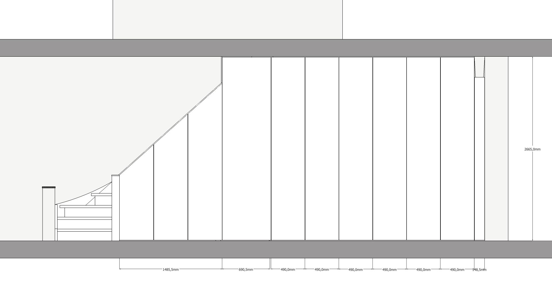 We maakten een plan op waarbij de volledige zijkant van de trap afgewerkt werd en toegang onder de trap bewaard kon blijven. De kasten behielden hun maximale diepte en bieden nu plaats om heel wat spullen op te bergen. Rechts van de kolomkast werd een smal front voorzien in functie van de achterliggende leidingen. Ideaal om ook deze ietwat verloren ruimte toch handig te benutten om een trapladder te plaatsen.