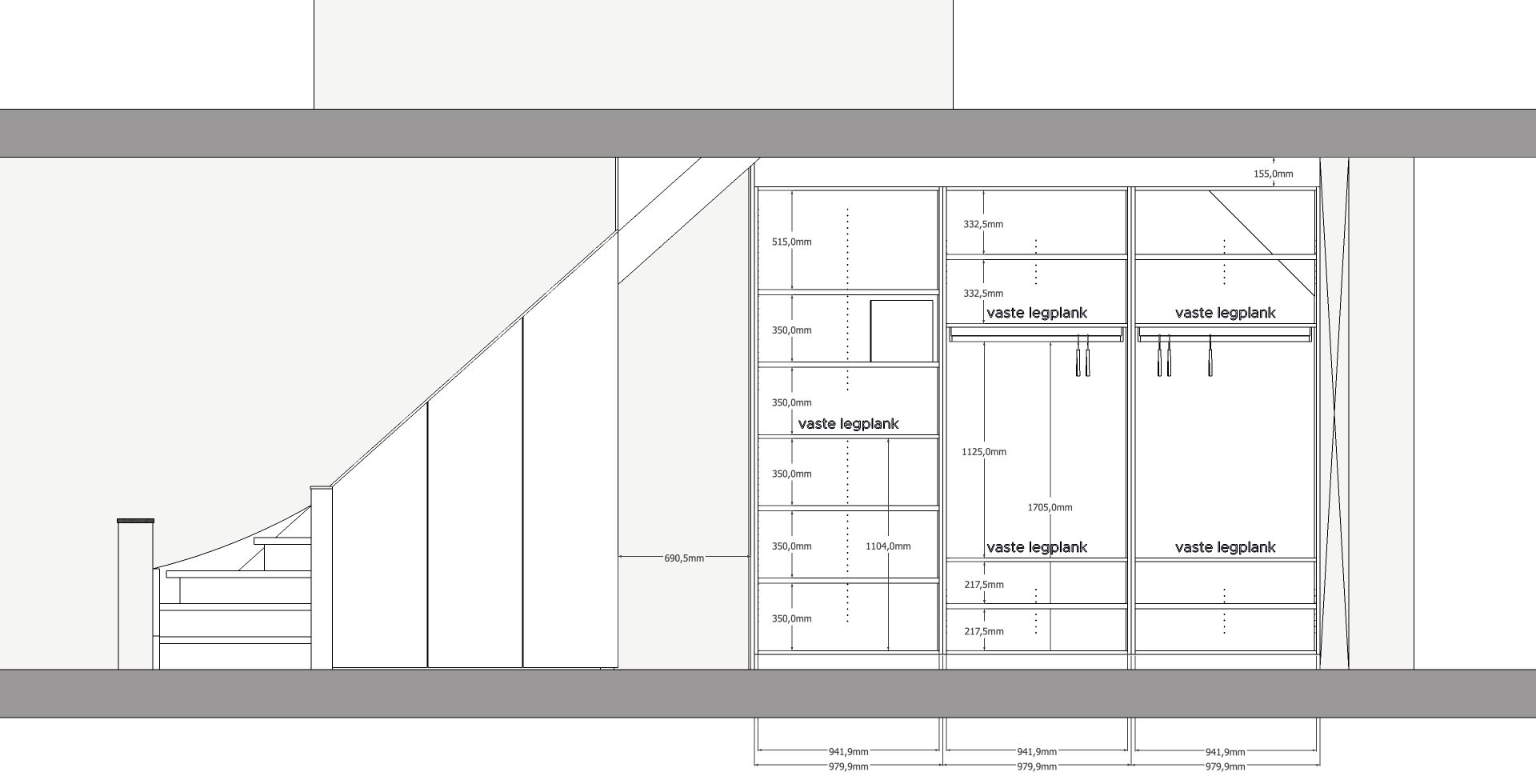 Onder het schuin dak plaatsten we deze dressing op maat. De binnenkanten werden uitgevoerd in laminaatplaten met een verouderde eiken-imitatie, de binnenkanten zijn in witte melamineplaten. Het ontwerp Zoals bij al onze projecten maken we op voorhand een digitaal ontwerp.