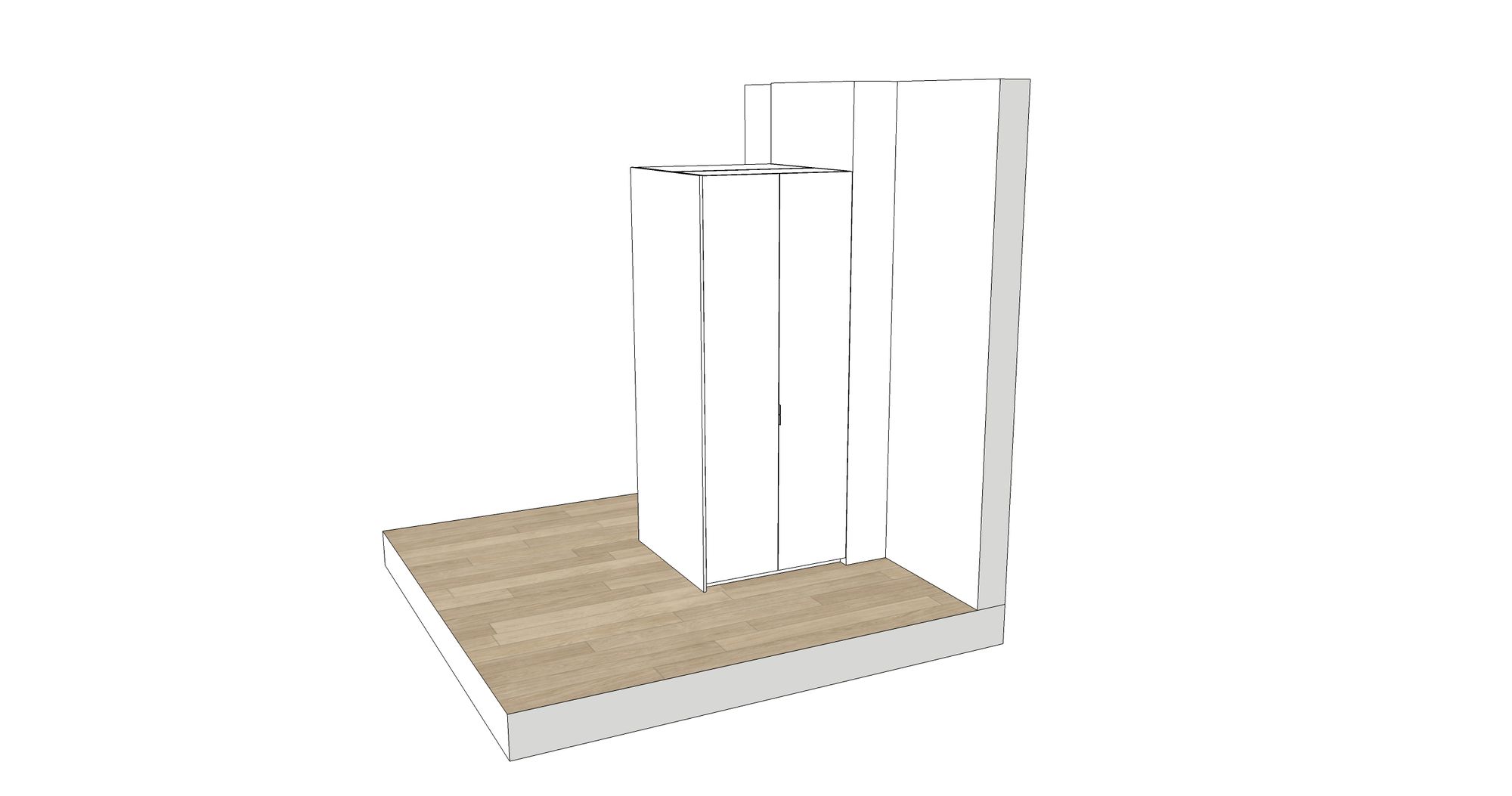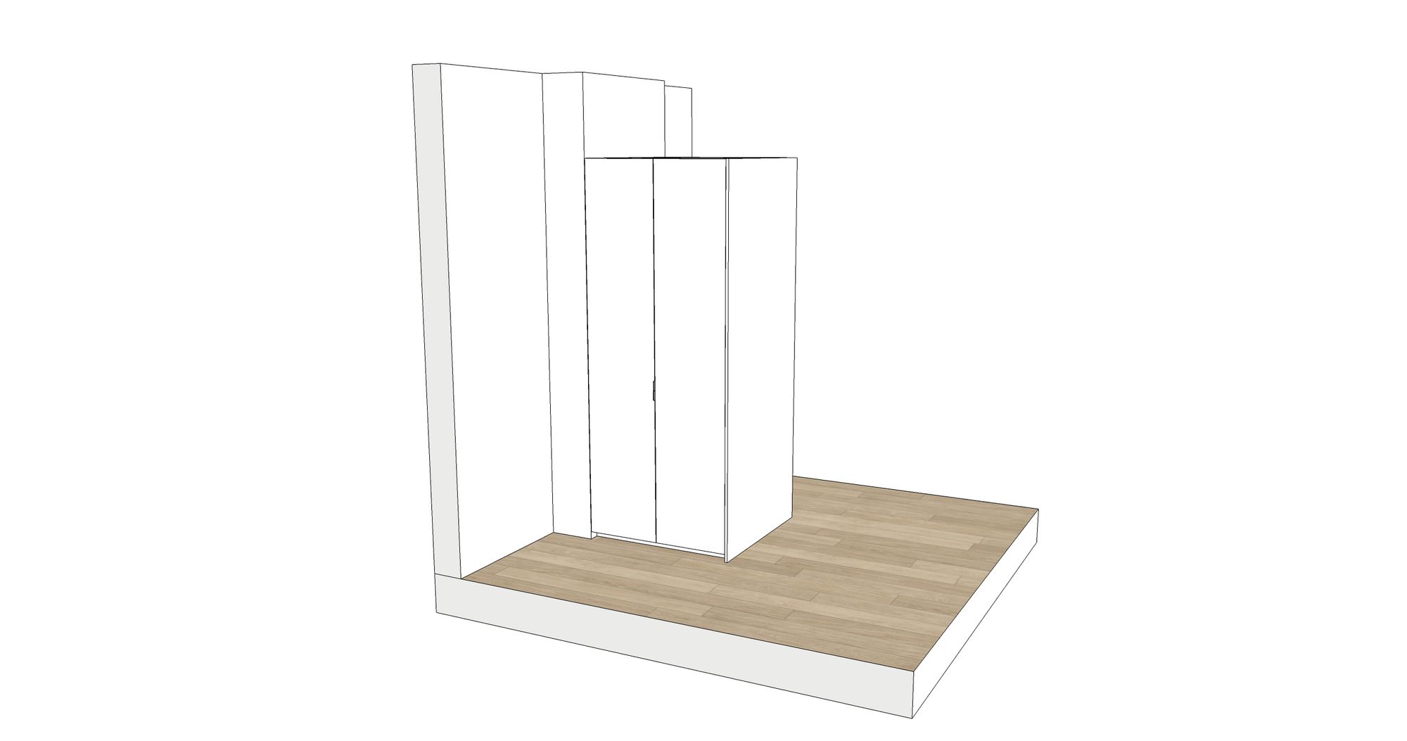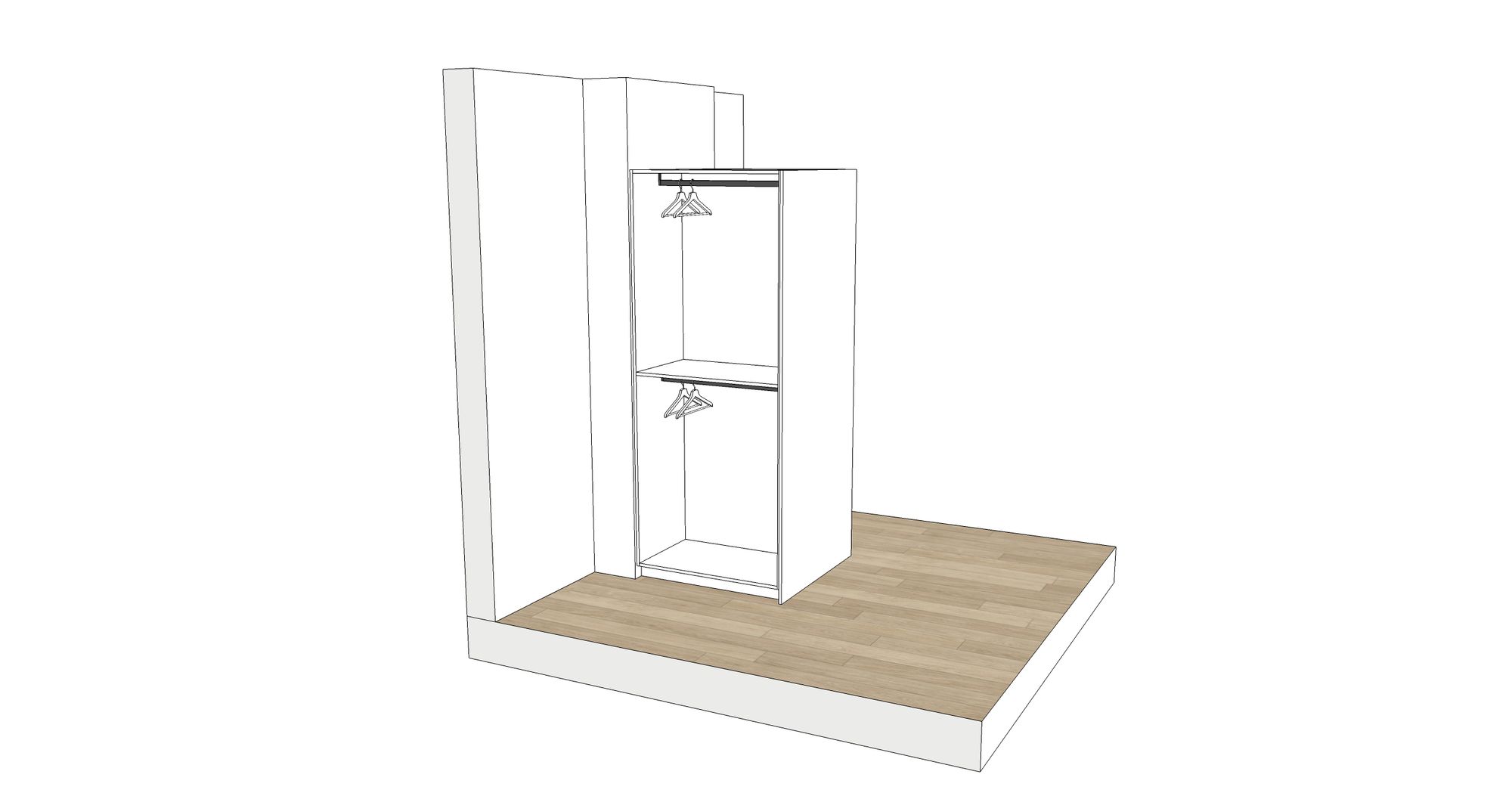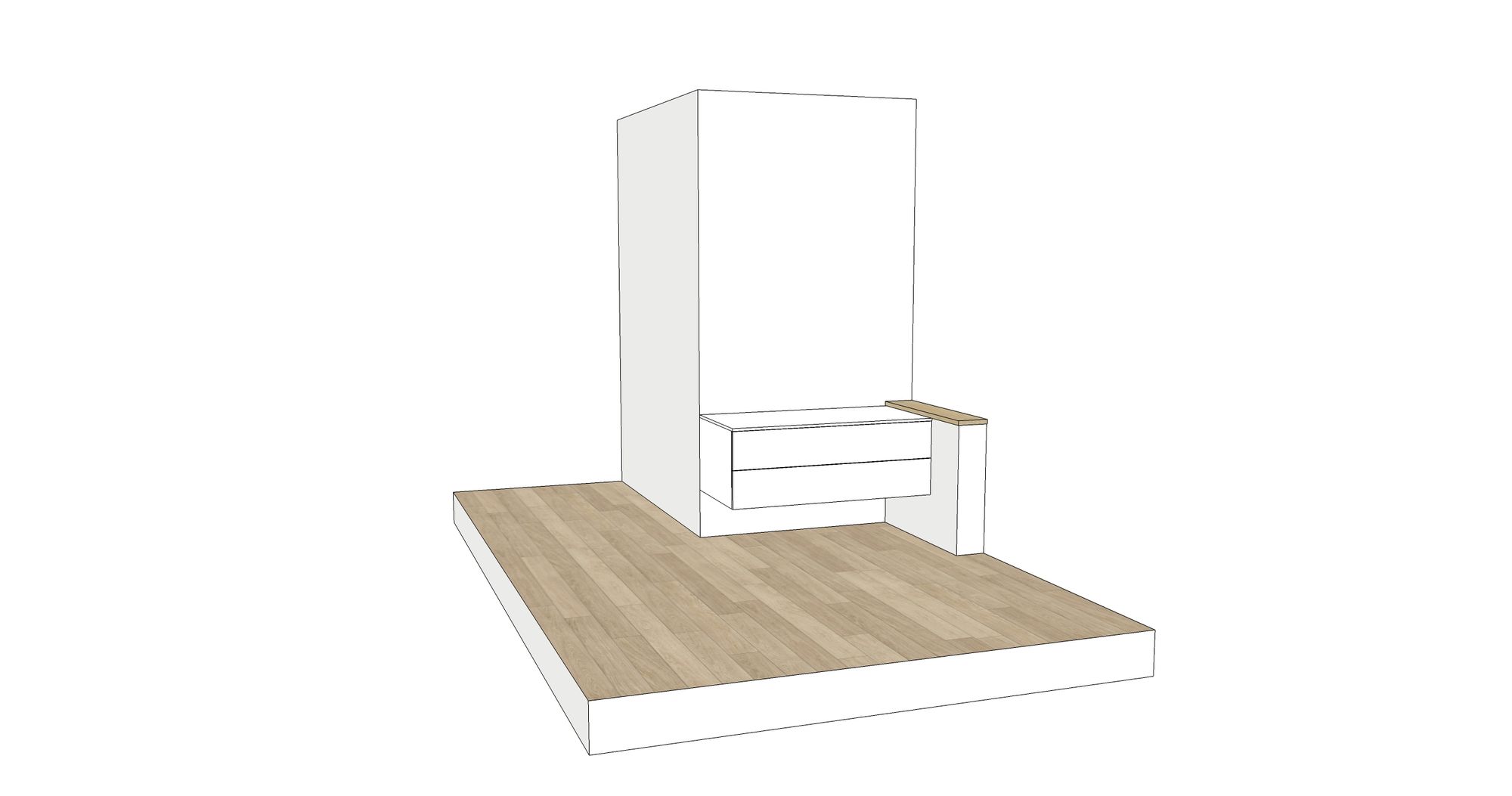 Onder het schuin dak plaatsten we deze dressing op maat. De binnenkanten werden uitgevoerd in laminaatplaten met een verouderde eiken-imitatie, de binnenkanten zijn in witte melamineplaten. Het ontwerp Zoals bij al onze projecten maken we op voorhand een digitaal ontwerp.