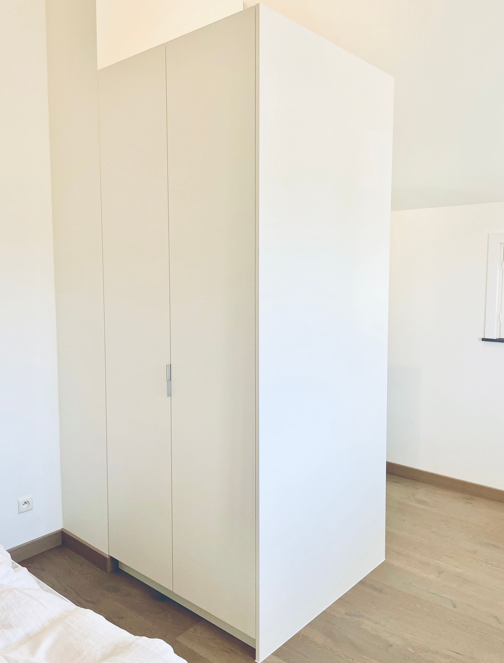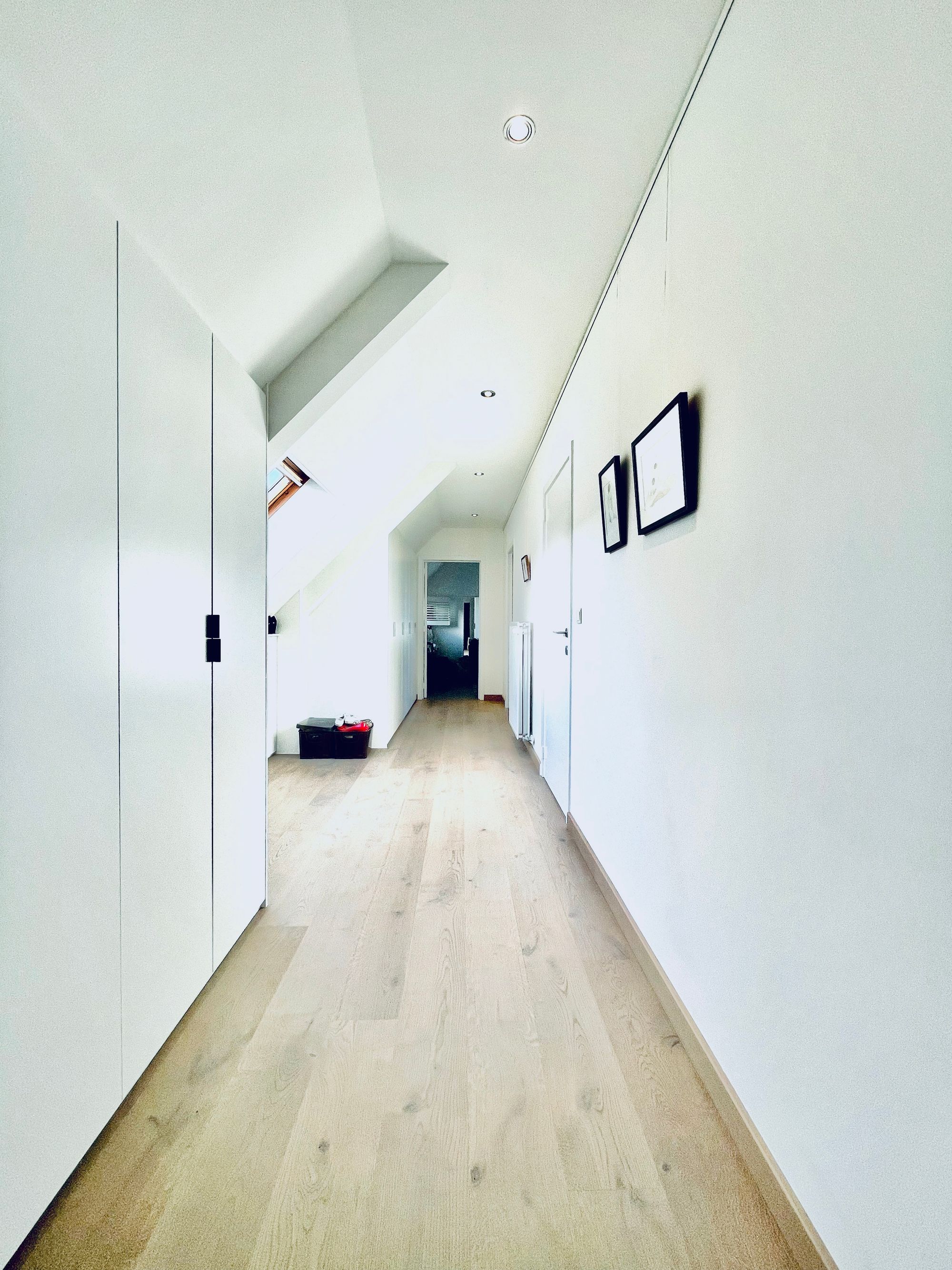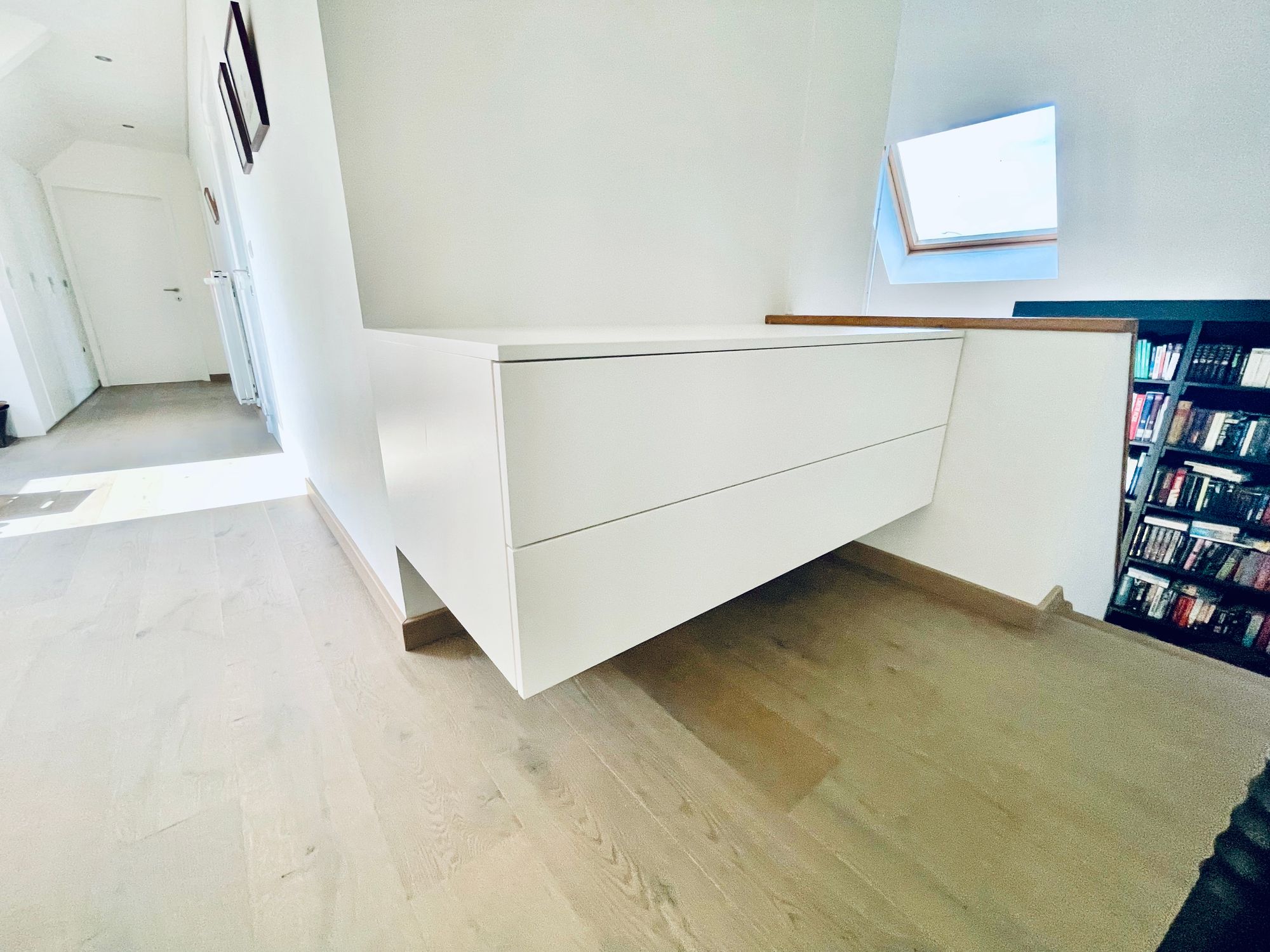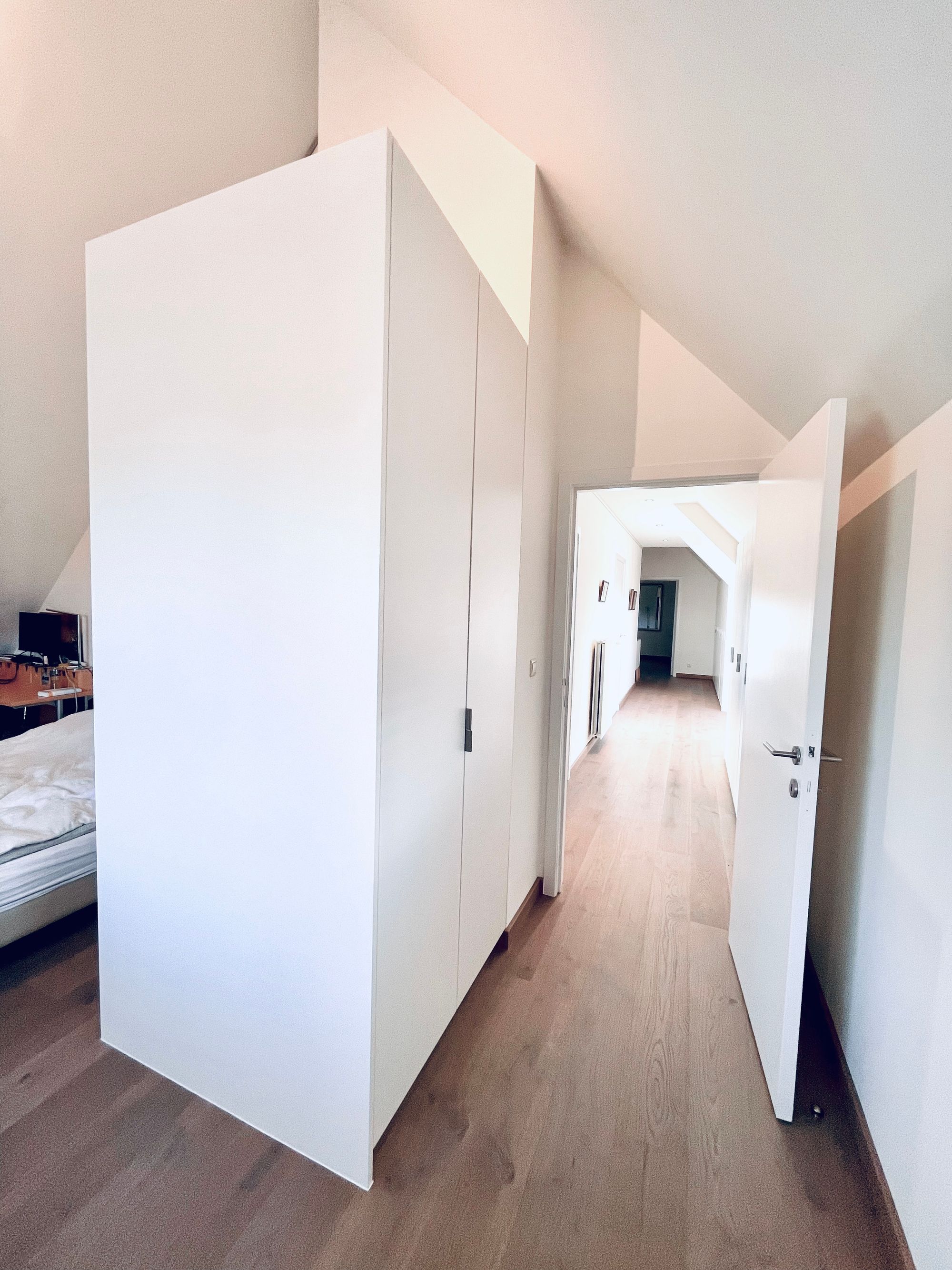 Bij dit project in Smetlede plaatsten we op de hele bovenverdieping een eiken parketvloer die doorloopt over alle kamers. Daarnaast werd ons gevraagd een dressingkast en zwevende ladeblok te voorzien. Beiden afgewerkt in gepoederlakte zichtbare delen.