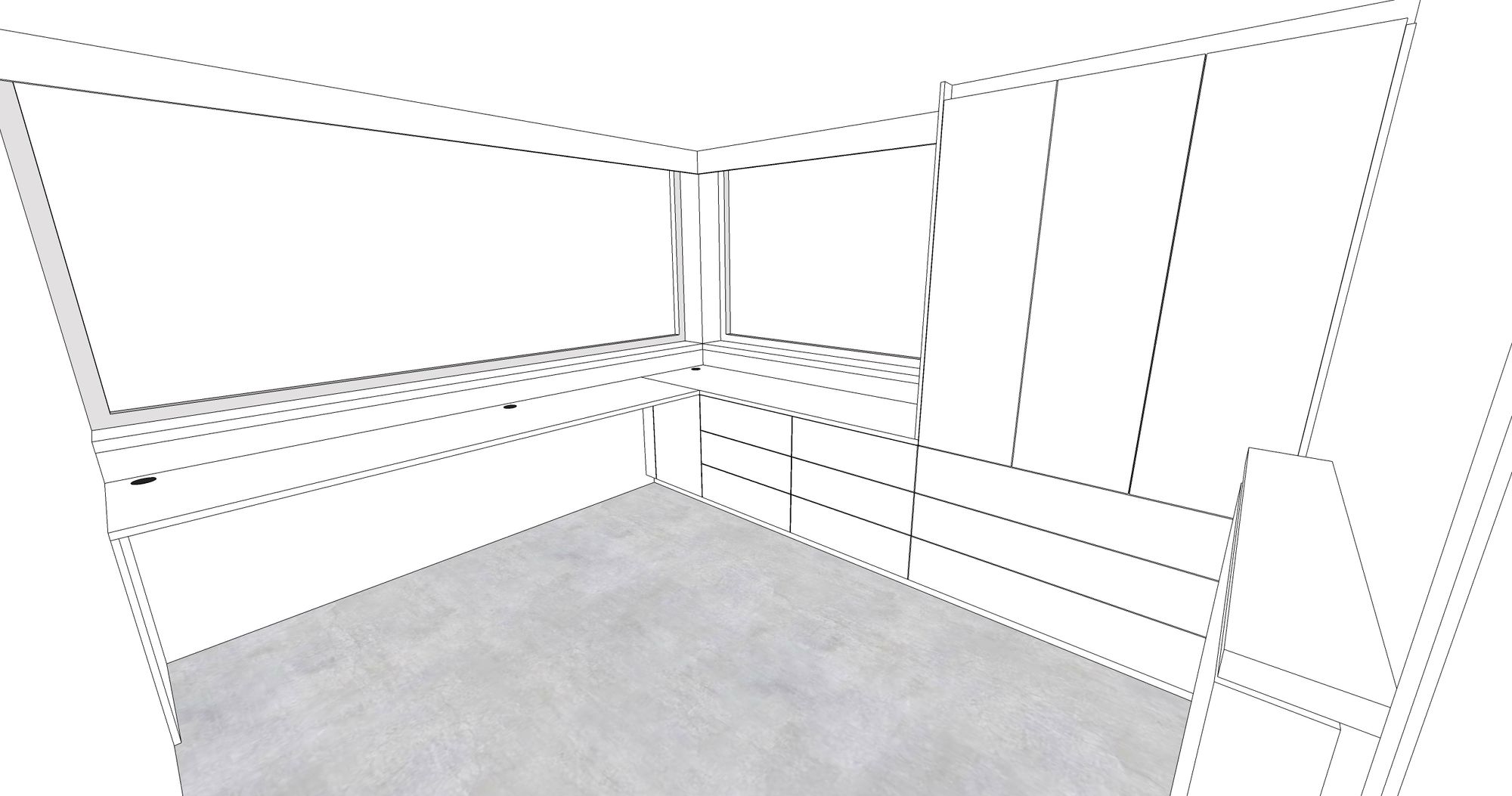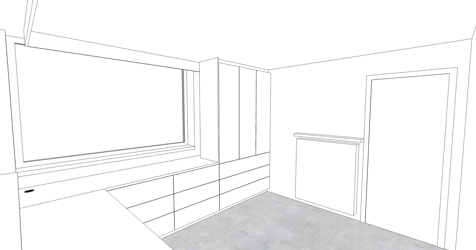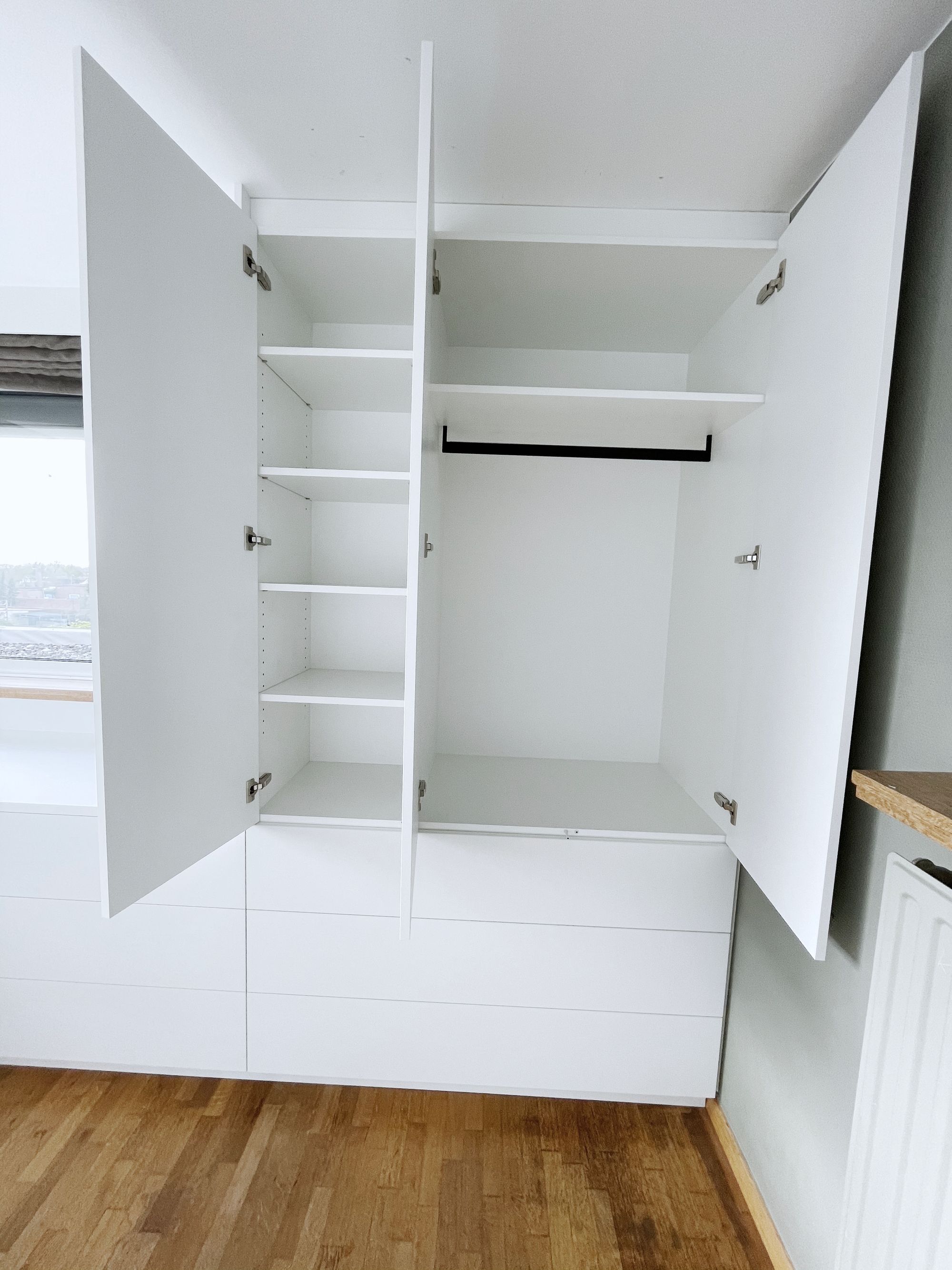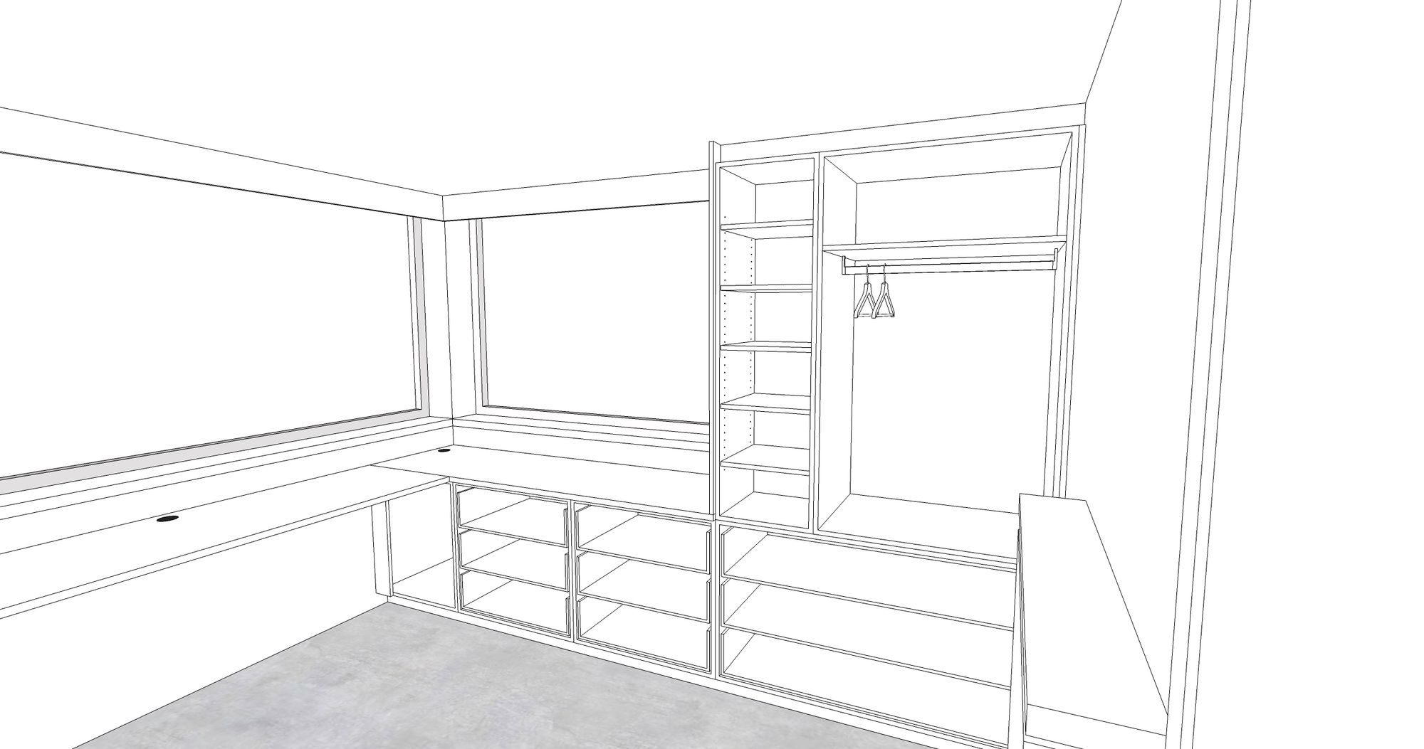Onder het schuin dak plaatsten we deze dressing op maat. De binnenkanten werden uitgevoerd in laminaatplaten met een verouderde eiken-imitatie, de binnenkanten zijn in witte melamineplaten. Het ontwerp Zoals bij al onze projecten maken we op voorhand een digitaal ontwerp.