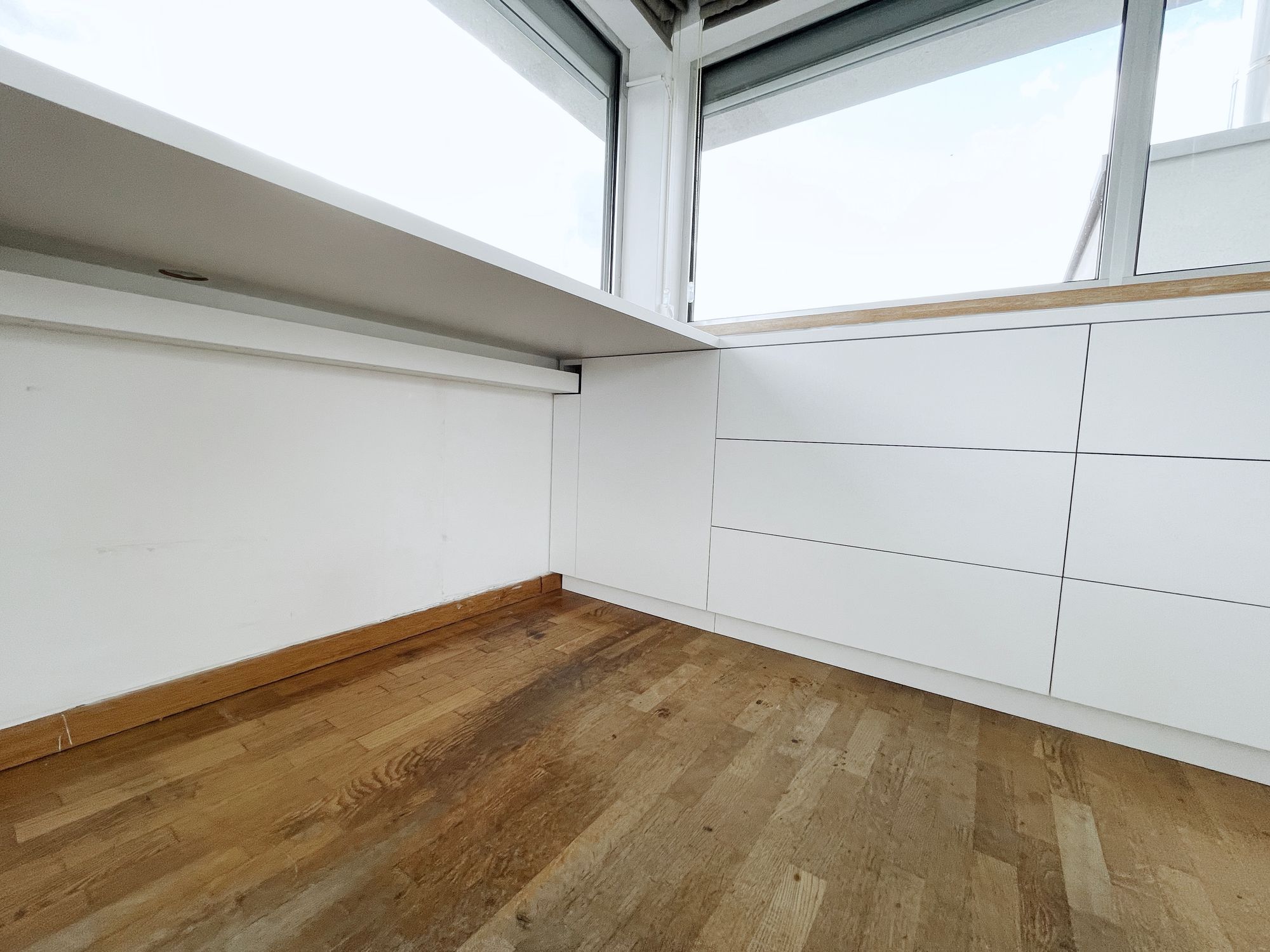Bij dit project lag de focus op het bureau-gedeelte waarbij kabels en andere technische noodzaken proper tot het zichtbare minimum werden beperkt. Zoals steeds werkten we ook hier met Blum-lades.
