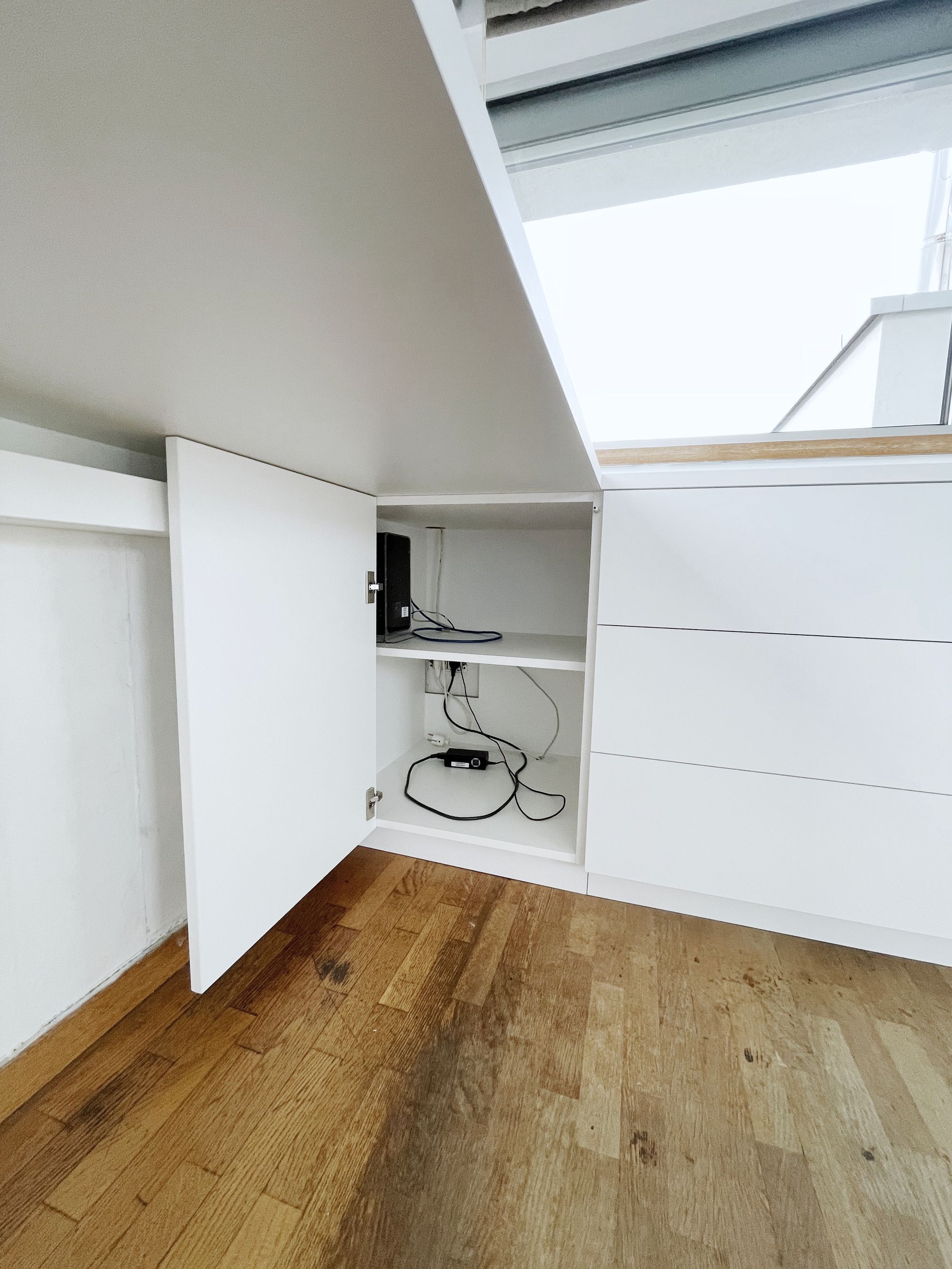 Deze massieve kast is een echte eye catcher. Met de ingebouwde BLUM-lades, is hij bovendien ook enorm praktisch. Bovendien werd hier rekening gehouden met een kleine uitstulping in de muur, iets dat alleen kan met echt maatwerk. De LED-verlichting en de witte inbouwkast maakt het het geheel helemaal af.