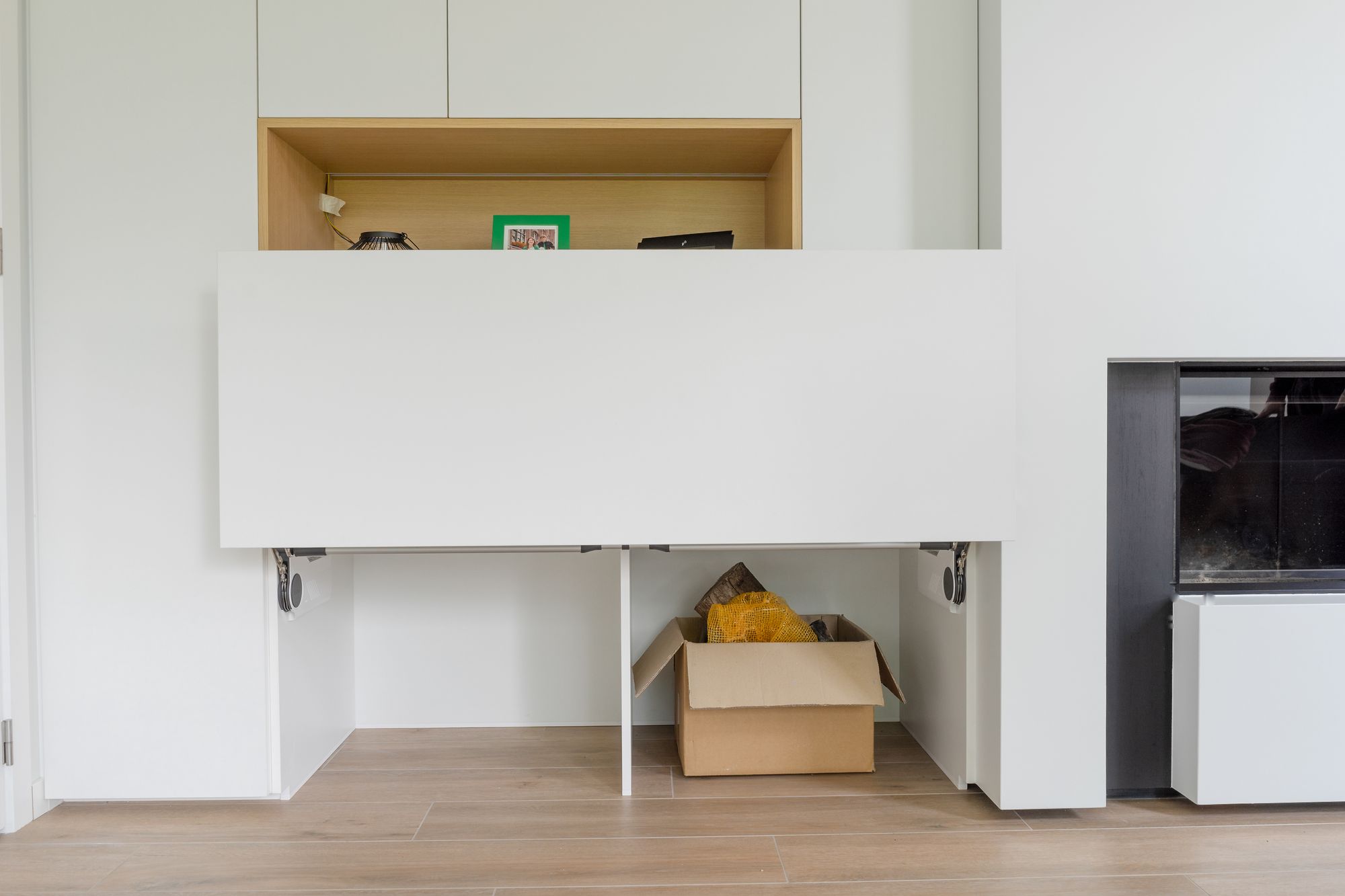 De verschillende maten van de kasten geven dit project haar unieke en moderne uitstraling. De kastdeur onderaan klapt omhoog zodat er o.a. hout kan worden opgeslagen en uitgerold. De kasten maken overal gebruik van blumotion scharnieren en zijn te openen via tip-on.